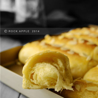 原料:高粉、鸡蛋、炼乳、细砂糖、动物性淡奶油、牛奶、干酵母、盐、奶粉、无盐黄油、杏仁片、蛋液。