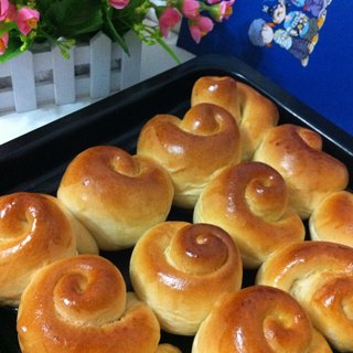 原料:高筋粉、白糖、鸡蛋、温水、牛奶、黄油、酵母、盐。