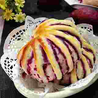 原料:高筋面粉、水、干酵母、细砂糖、全蛋、黄油、盐、紫薯、细砂糖。