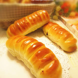 原料:高粉、低粉、酵母、鸡蛋、牛奶、水、糖、黄油、老面团、香肠、芝士条、蛋液。