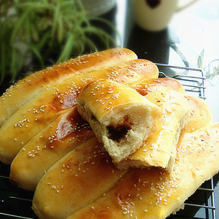 原料:面包粉、中筋面粉、无盐黄油、全蛋液、白砂糖、盐、酵母、牛奶、自制蜜红豆、脱皮白芝麻、表面装饰蛋液。