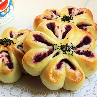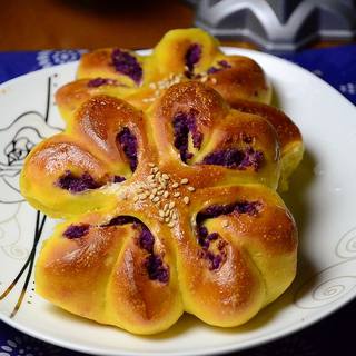 原料:高粉、牛奶、鸡蛋、紫薯泥、黄油、糖、盐、酵母、黑芝麻。