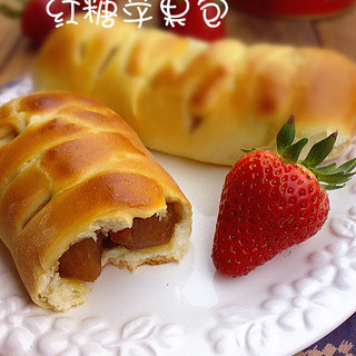 原料:高粉、酵母、水、蛋、黄油、盐、糖、表面蛋液、红糖苹果馅。