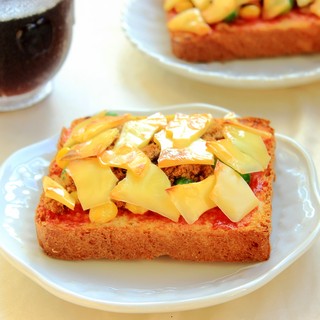 原料:吐司片、青豆、玉米粒、肉松、番茄酱、芝士片。