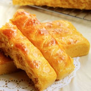 原料:高筋粉、低筋粉、红薯泥、细砂糖、盐、全蛋液、牛奶、黄油。