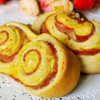 原料:高粉、牛奶、鸡蛋、培根、奶酪芝士、糖、酵母、黄油、盐。