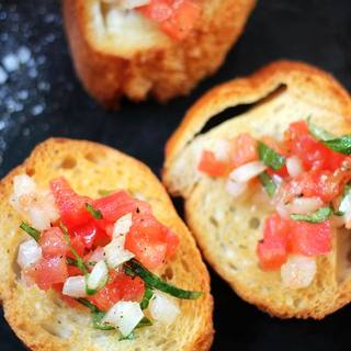 原料:法式面包、番茄、洋葱、罗勒叶、橄榄油、黄油、海盐、黑胡椒碎。