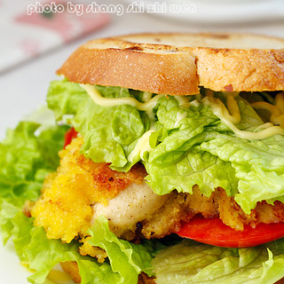 原料:鸡腿、生菜、西红柿、面包片、鸡蛋、面包糠、黄油、油、盐、黑胡椒粉、白朗姆酒、沙拉酱。