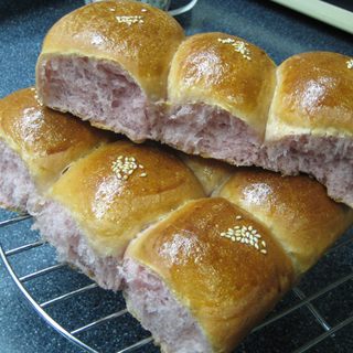 原料:高筋粉、紫薯泥、奶粉、白糖、黄油、鸡蛋、牛奶、盐、酵母、芝麻。