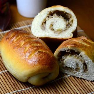 原料:面包面团、核桃仁、熟面粉、糖粉、黄油。