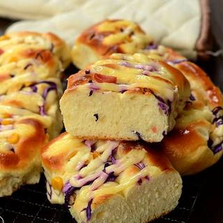 原料:高筋面粉、水、酵母、高筋面粉、糖、盐、鸡蛋、淡奶油、牛奶、酵母、黄油、紫椰菜、熟玉米粒、火腿肠、沙拉酱。