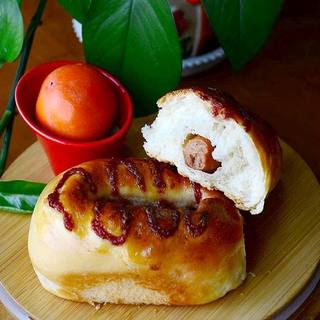 原料:高筋粉、鸡蛋、葡萄籽油、糖、酵母粉、盐、烤肠、番茄酱。