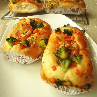 原料:高筋粉、牛奶、鸡蛋、盐、黄油、白糖、酵母、丘比千岛酱、鲜虾、胡萝卜、西兰花、盐、蚝油、料酒、黑胡椒粉、生姜、橄榄油。