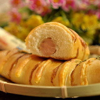 原料:高粉、低粉、酵母、鸡蛋、奶粉、水、黄油、火腿肠、盐、细砂糖、丘比沙拉酱、片状芝士、全蛋液、欧芹碎。