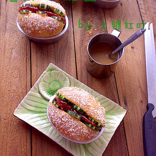 原料:高粉、低粉、糖、盐、酵母、水、蛋、黄油、蜜汁叉烧、黄瓜片、表面蛋液、面包糖、蜜汁叉烧酱。