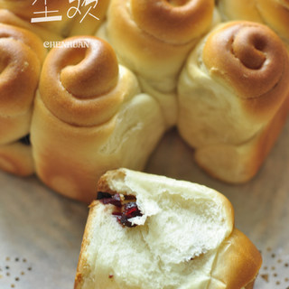原料:高筋面粉、纯糖粉、奶粉、盐、蛋液、干酵母、黄油、清水、黑糯米馅。