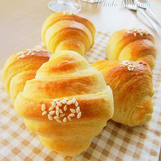 原料:高筋面粉、低筋面粉、干酵母、鸡蛋、牛奶、黄油、糖。