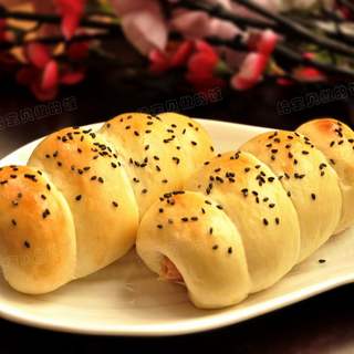 原料:高粉、奶粉、糖、盐、鸡蛋、酵母、水、黄油、烤香肠、黑芝麻。