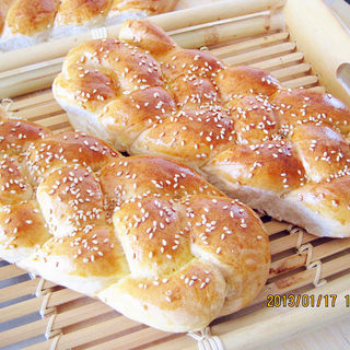 原料:高筋面粉、牛奶、全蛋液、糖、奶粉、酵母、盐、黄油、香葱、香肠、肉松、沙拉酱、芝麻。