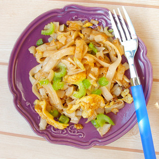 原料:河粉、西芹、鸡蛋、油、盐、酱油。