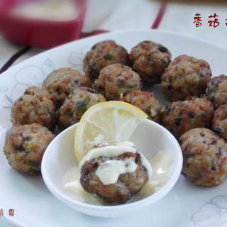 原料:瘦肉末、香菇、鸡蛋、面粉、香葱、辣椒酱、黑胡椒粉、丘比沙拉酱、柠檬、盐、油。