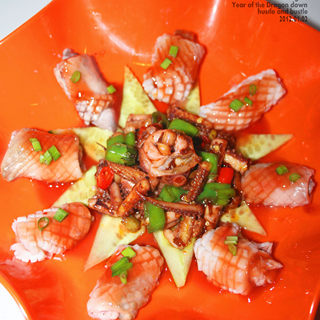 原料:鲜鱿鱼、黄瓜、小米椒、尖椒、小葱、咸盐、鸡精、番茄酱、白砂糖、黑胡椒、料酒、甜辣酱。