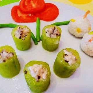 原料:鸡肉、香菇、黄瓜、料酒、盐、淀粉。