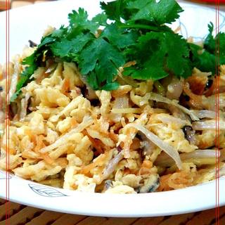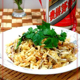 原料:熟干贝丝、鸡蛋、冬笋丝、香菇丝、金华火腿丝、五花肉丝、芫荽、葱丝、姜丝、盐、鸡粉、白胡椒粉、绍酒、烹调油。