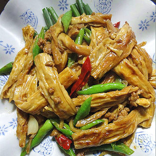 原料:腐竹、杭椒、肉末、面粉。