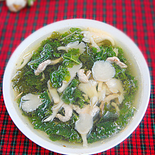 原料:羽衣甘蓝、蘑菇、瘦肉、姜丝、麻油、盐、鸡精、料酒。