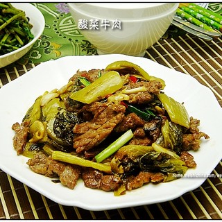 原料:牛肉、潮州酸菜、姜片、葱段、蒜粒、红辣椒、生抽、鲍鱼汁、胡椒粉、姜汁、麻油、米酒、糖、淀粉、淀粉水。