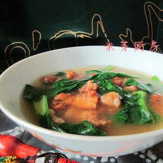 原料:猪瘦肉、小青菜、酱油、盐、鸡粉、胡椒粉、红薯粉、盐、鸡精。