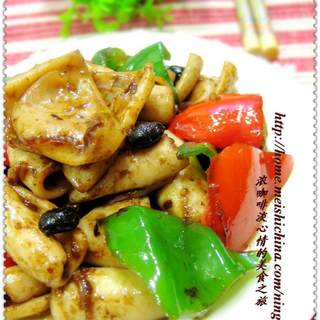 原料:墨斗鱼、红椒、青椒、蚝油、料酒、植物油、豆豉、胡椒粉、鸡精、生抽、蒜蓉。