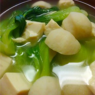 原料:油菜、鱼丸、豆腐、鸡汤、姜、白胡椒粉、盐。