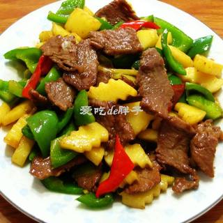原料:牛肉、青椒、红辣椒、红富士苹果、葱、姜、干淀粉、五香粉、蚝油、美极鲜、盐。