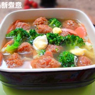 原料:鹌鹑蛋、西兰花、肉丸、火腿片、油、盐、高汤精。