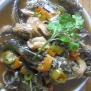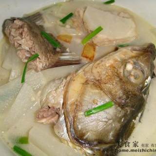 原料:鱼头、鱼骨、萝卜、生姜、葱。