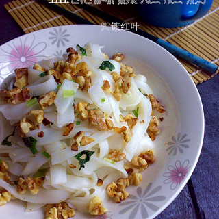 原料:鲜河粉、核桃仁、香菜、花椒粉、米酒、水、鸡粉、胡椒粉、糖、盐。