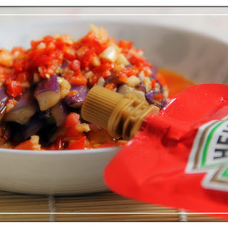 原料:茄子、红椒、亨氏番茄酱、蒜瓣、盐、白糖。