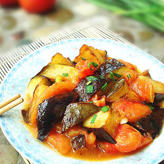 原料:圆茄子、西红柿、葱末、蒜末、食用油、玉米淀粉、盐、生抽、香油、白糖。