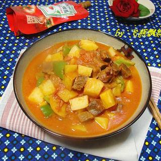 原料:熟牛腩、小土豆、番茄、青椒、亨氏番茄酱、玉米油、生抽、盐、姜片、水。