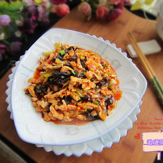原料:笋、木耳、猪肉、油、干辣椒、料酒、盐、泡椒、淀粉、糖、醋、蒜、姜。