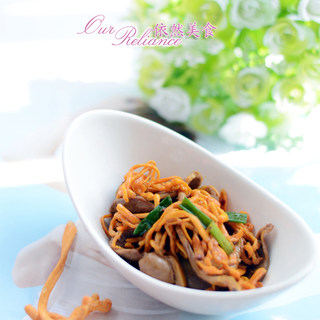 原料:新鲜虫草花、鸭胗、香葱、生姜、调和油、风味辣酱、料酒、蒸鱼鼓油、盐、味精。