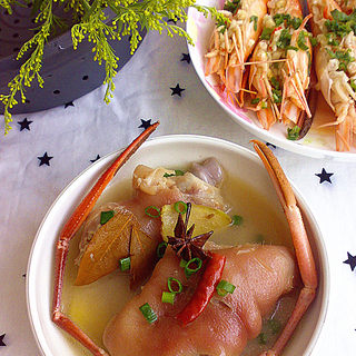 原料:猪手、大头虾、香叶、茴香、干辣椒、桂皮、葱、香菜、指天椒、姜片、水、蒜头、八角、盐、糖、鸡粉、酒、胡椒粉、色拉油。