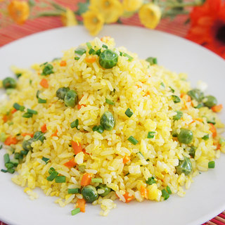 原料:米饭、鸡蛋、碗豆、红萝卜、青瓜、葱、盐、胡椒粉、油。