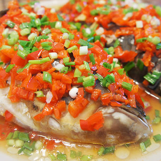 原料:大头鱼鱼头、红椒、姜、葱、料酒、生抽、盐。