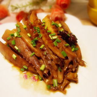 原料:春笋、食用油、白糖、盐、八角、姜片、生抽、老抽、黄酒、青蒜末。