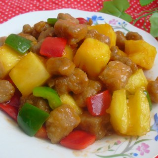原料:猪里脊、菠萝、水淀粉、青椒、红椒、番茄酱、米醋、白糖、生抽、胡椒粉。