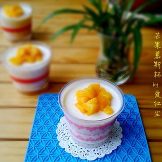 原料:鲜牛奶、淡奶油、吉利丁片、酸奶、芒果、细砂糖。