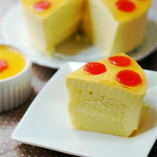 原料:戚风蛋糕、淡奶油、白砂糖、酸奶、樱桃酱、牛奶、鱼胶粉、樱桃、淡奶油。